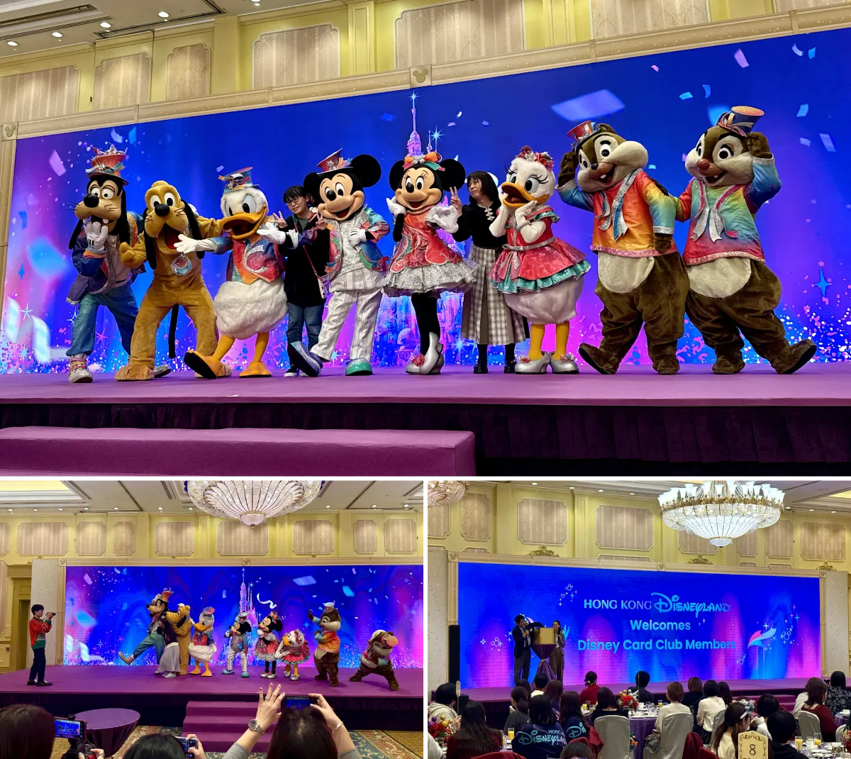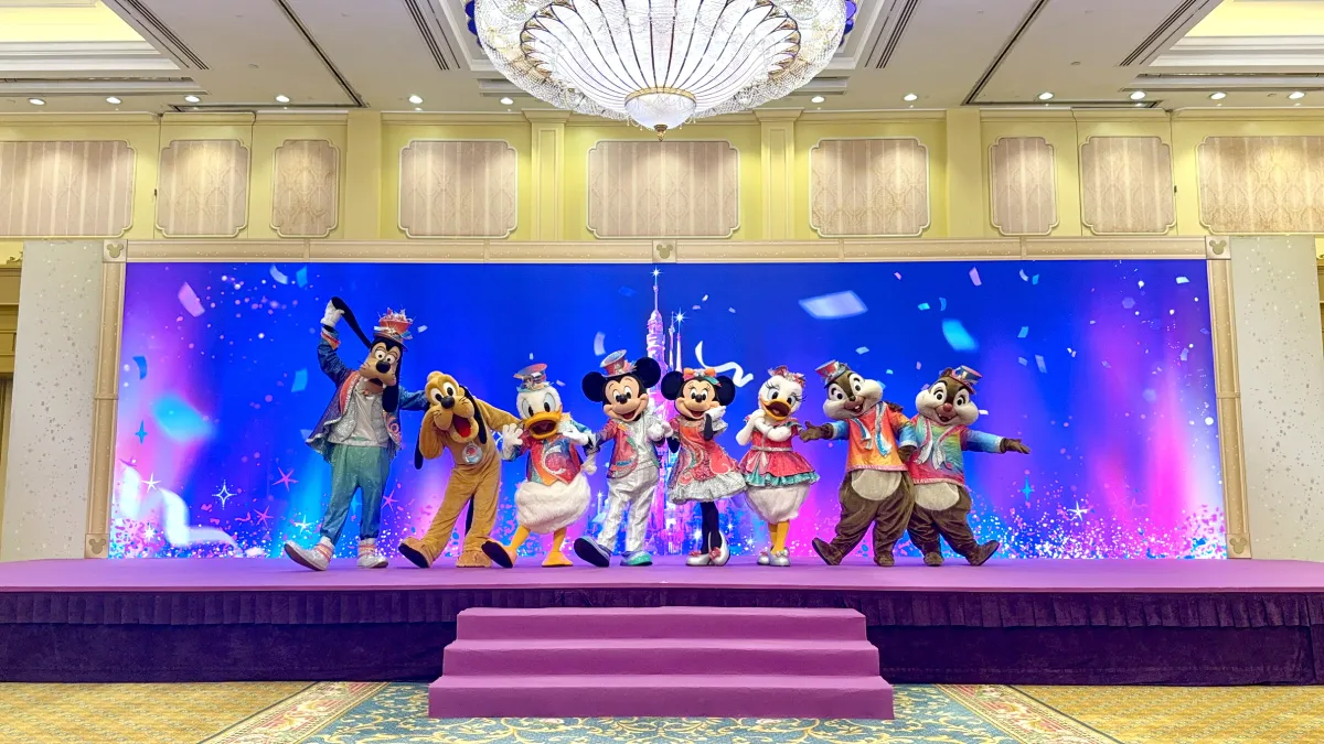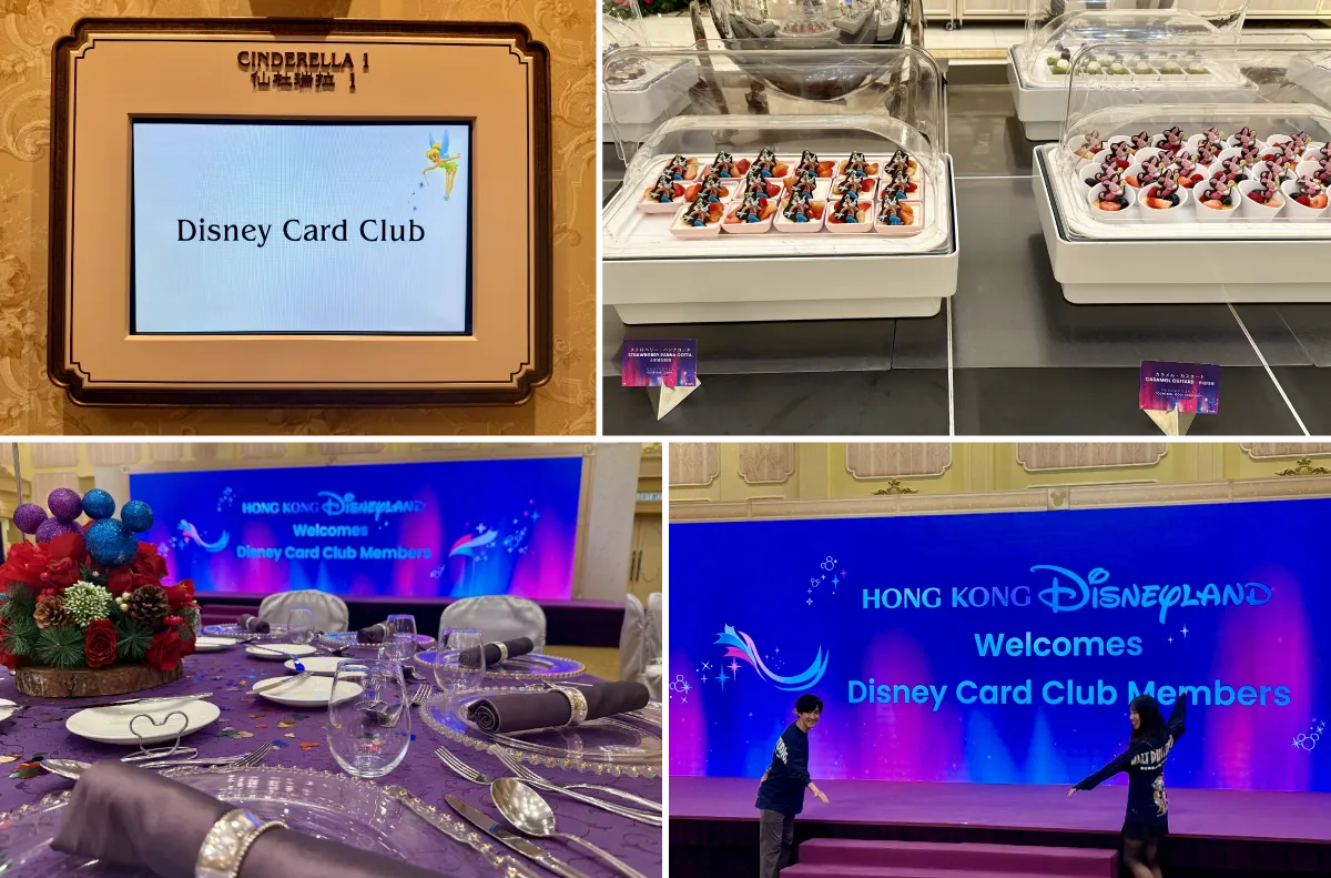 このツアーのメインイベントはメンバー限定パーティー。香港ディズニーランド・ホテルの各所に表示された「Disney Card Club」の表示に従って進んでいくと宴会場「シンデレラ・ボール・ルーム」に到着。20周年限定のステージセットがメンバーの皆さんをお迎えします。