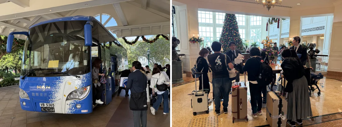 ホテルのチェックインも事前にスタッフが済ませていたので、専用バスで空港からホテルに移動してきたメンバーの皆さんをそのままスムーズにお部屋へご案内しました。チケットの日付変更や追加購入など、さまざまなご質問にもその場でサポート!